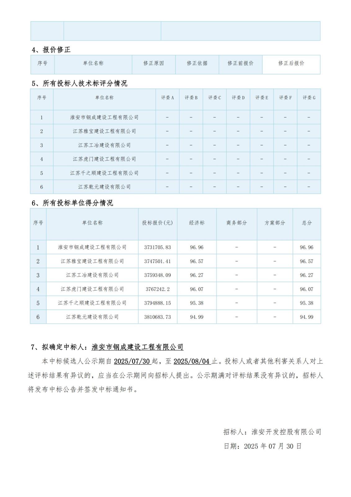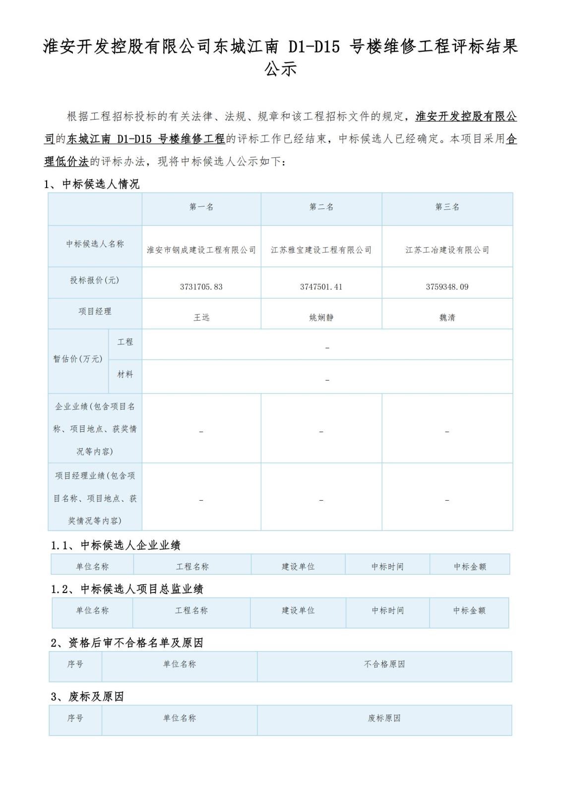 淮安開發控股有限公司東城江南 D1-D15 號樓維修工程評標結果公示
