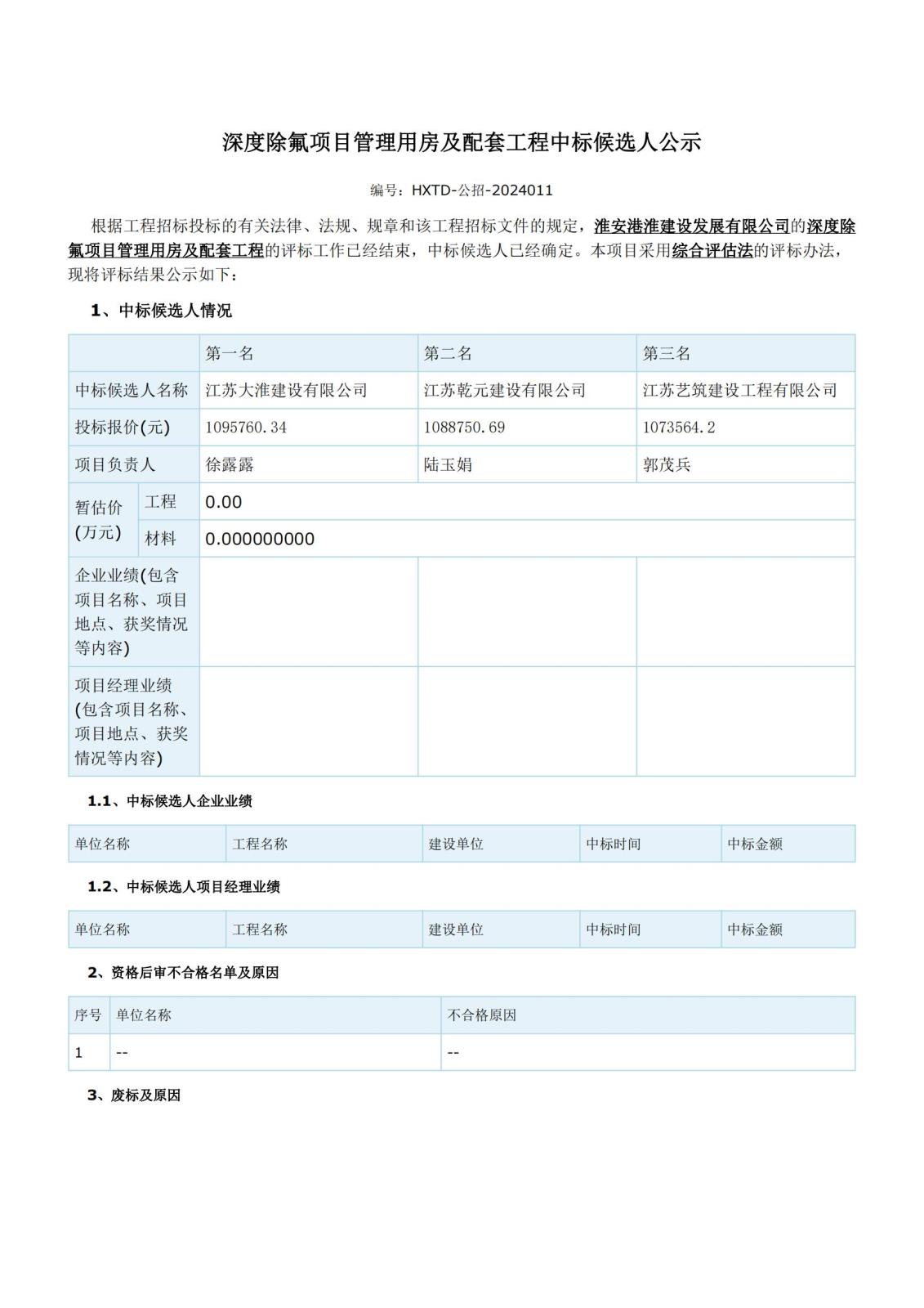 深度除氟項目管理用房及配套工程中標(biāo)候選人公示
