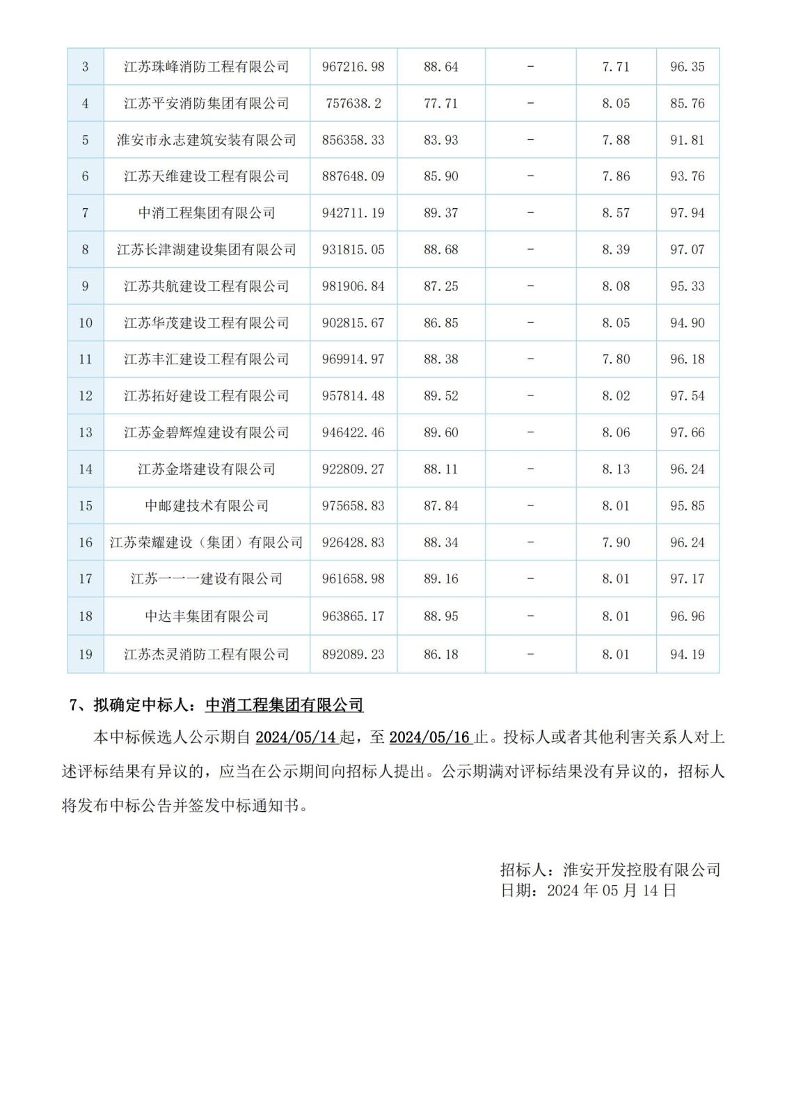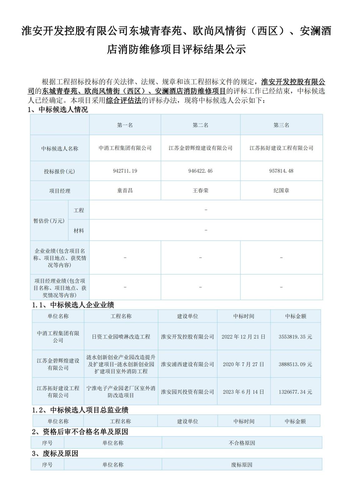 淮安開發控股有限公司東城青春苑、歐尚風情街(西區)、安瀾酒店消防維修項目評標結果公示